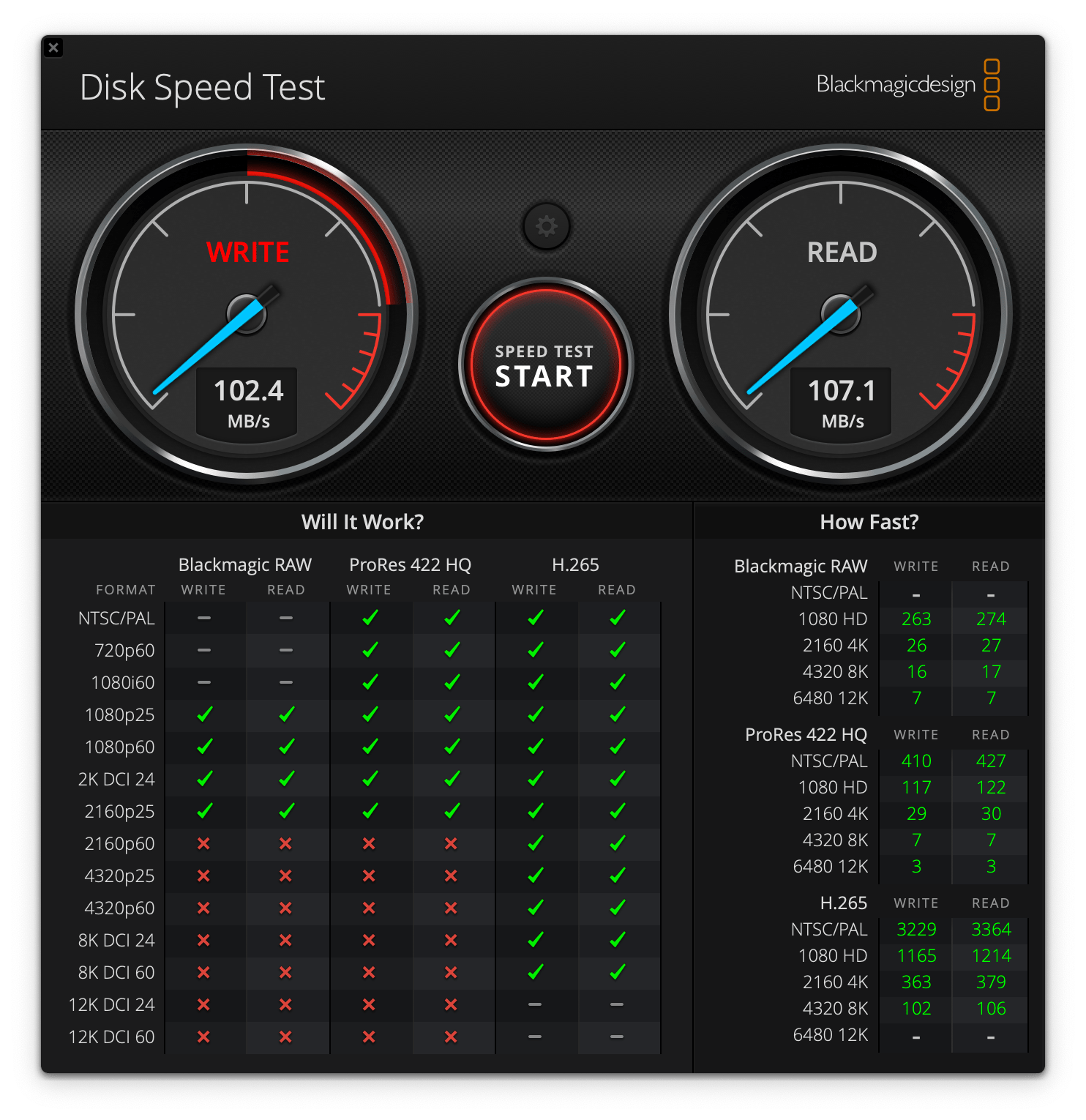 As to the actual performance numbers, Disk Speed Test showed familiar hard drive-like performance: 102MBps writes, and 107MBps reads.