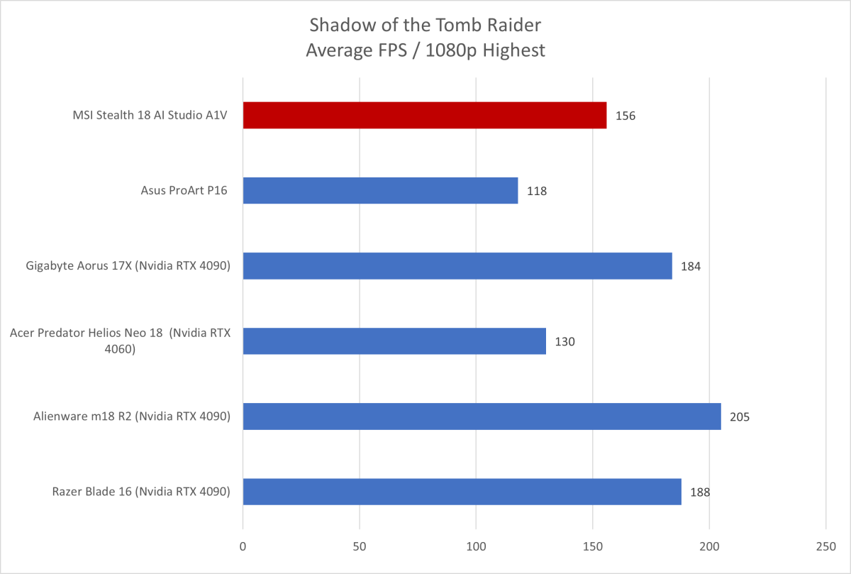 Shadow of the Tomb Raider, though now an older game, remains representative of games from the PlayStation 4 and Xbox One console generation. Unsurprisingly, the Stealth handled this game with ease and achieved a frame rate average above 150 frames per second. But, once again, the Stealth’s performance falls behind other laptops with Nvidia RTX 4090 graphics.